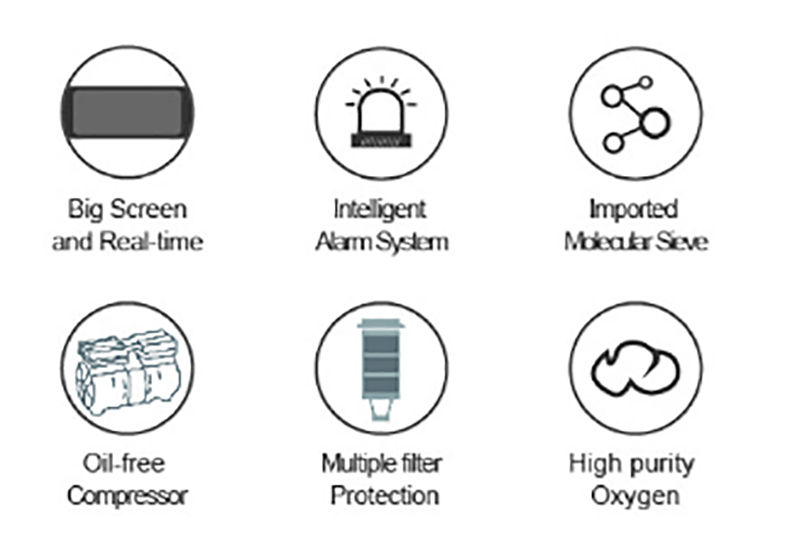 ♦Power off alarm, Overload protection, High/Low pressure alarm, Temperature alarm, Error code indication, Nebulizer, Oxygen purity alarm